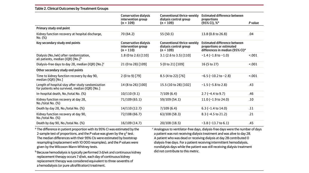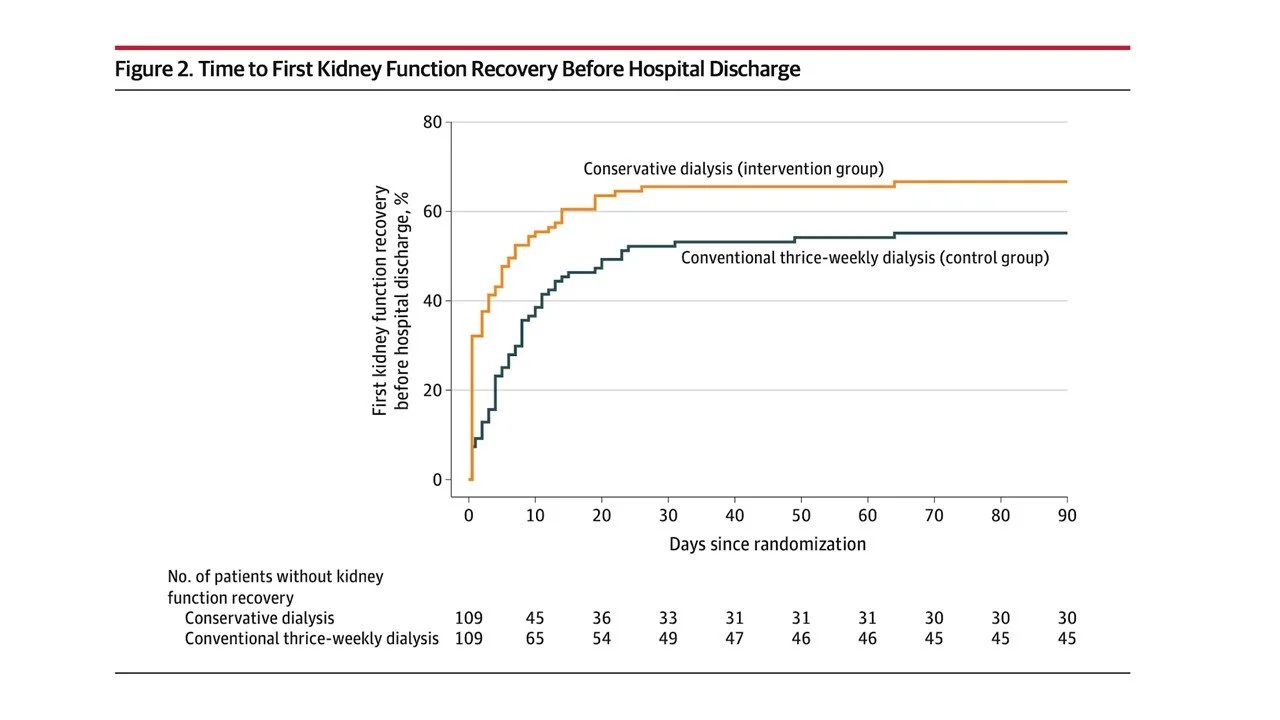 The primary endpoint of the study was to evaluate kidney function recovery at hospital discharge. Recovery was defined as being alive and free from dialysis for at least 14 consecutive days, including after discharge. Notably, patients who recovered kidney function but did not survive hospitalization were not counted.