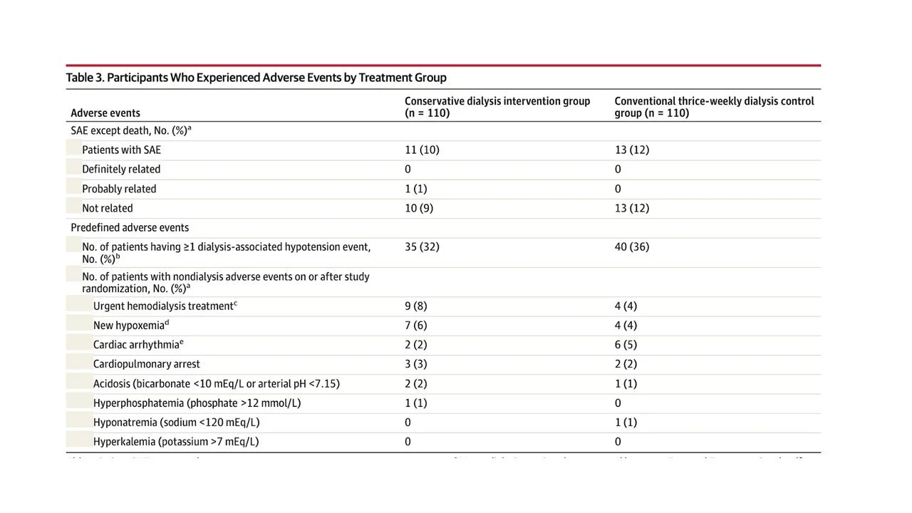 Serious adverse events were uncommon and predominantly unrelated to the intervention. Dialysis-associated hypotension was less frequent with the conservative strategy, despite slightly higher ultrafiltration rates.
