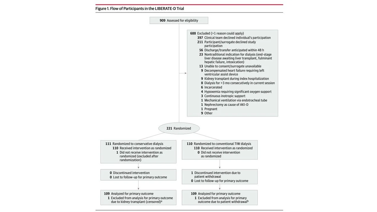 A previous pilot trial at UCSF (RAD-AKI) suggested that limiting dialysis exposure could improve kidney recovery: 67% of patients in the conservative group recovered kidney function by discharge compared with just 40% in the thrice-weekly hemodialysis group. The LIBERATE-D trial planned enrollment of 220 participants, providing 80% power to detect a prespecified, clinically relevant 20% absolute difference in recovery rates between groups.