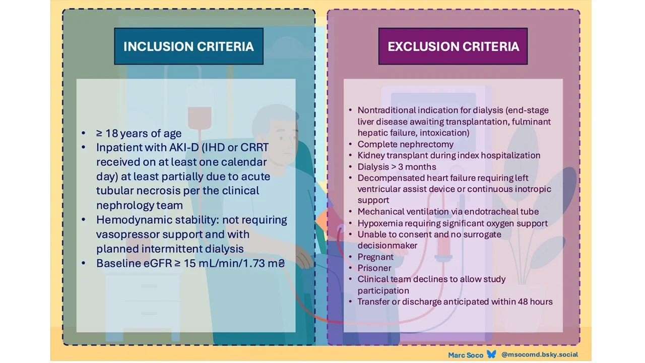 The trial enrolled hospitalized adults (≥18 years) with AKI requiring at least one day of dialysis, attributed at least partly to ATN, and planned for further dialysis. Participants needed to be hemodynamically stable and have a baseline eGFR ≥15 mL/min/1.73 m², as calculated by the 2009 CKD-EPI equation. In June 2021, eligibility expanded to include younger (<65 years), low-risk patients without baseline creatinine measurements. Key exclusions included mechanical ventilation, severe hypoxemia, advanced heart failure, recent long-term dialysis, or imminent transfer/discharge.